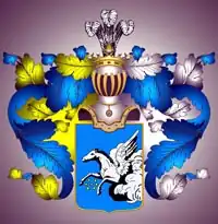 В щите, имеющем голубое поле, изображён выходящий из облаков крылатый Пегас серебряный, у которого между копыт видны семь золотых звёзд. Щит увенчан дворянским шлемом и короной на нём, а также тремя страусовыми перьями. Намёт на щит голубой, подложен с правой стороны золотом, а с левой серебром.