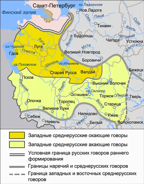 Окающие говоры размещаются в северных районах западных среднерусских говоров, занимая территории севера Псковской области, юго-запада Ленинградской области и большей части юго-запада Новгородской области.