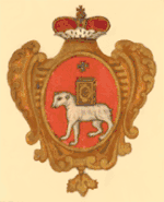 Белый баран, лежащий в огне на дровах, что учинил Санти, поле лазуревое. |