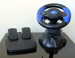 - Гоночный геймпад — для упрощения игры в гонки на приставке. По сути, это обычный геймпад, в который встроена дополнительная рулевая ось (а иногда и аналоговые кнопки газа и тормоза). Такое устройство стоит намного дешевле полноценного руля.