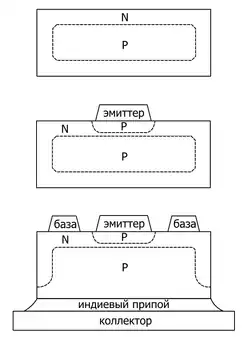 Диффузионно-сплавной меза-транзистор по Дэйси, Ли и Шокли (1955). Три этапа технологии: диффузия базы (из газовой среды), сплавление эмиттера, пайка к основанию