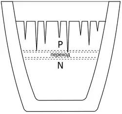 Вскоре Скафф и Ол буквально увидели этот барьер: травление азотной кислотой вскрыло видимую глазу границу между двумя слоями кремния[17]. Скафф и Ол дали этим слоям новые названия: «кремний p-типа» (от англ. positive, положительный) и «кремний n-типа» (negative, отрицательный), в зависимости от направления тока в изготавливаемых из этих слоёв детекторах[17]. Барьерная зона получила название p-n-переход[18]. Постепенно Ол, Скафф и Тойерер пришли к пониманию того, что тип проводимости кремния определяется не его чистотой, а, напротив, присутствием характерных примесей[18]. Более лёгкие элементы подгруппы бора должны были сосредотачиваться в верхнем слое расплава, более тяжёлые элементы подгруппы азота — в центре тигля[18]. Действительно, химический анализ кремния p-типа выявил следы бора и алюминия, а присутствие фосфора в грубо очищенном кремнии n-типа ощущалось и без приборов — при обработке такого кремния выделялся фосфин[18].