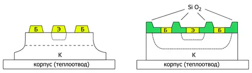 Отличие планарной технологии Эрни (справа) от меза-технологии (слева). Высоты слоёв показаны схематично
