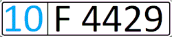 Формат знака — двузначный код региона (голубые цифры), две буквы и три цифры чёрного цвета. Код региона расположен в отдельном окне слева. Двухрядный номерной знак юридических лиц содержит три цифры в верхнем ряду, две буквы и код региона — в нижнем. |