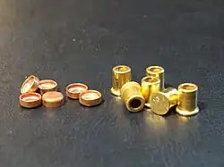 Капсюли Боксера разных размеров для пистолетных патронов: стреляные (слева) не стреляные (в центре) и изнутри (справа)