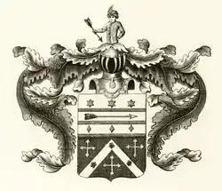 На щите дворянский коронованный шлем. Нашлемник: выходящий человек, имеющий на голове зелёную чалму с перьями, а в правой руке — стрелу, острием вниз обращенную. Намёт на щите голубой, подложенный серебром (Гербовник, III, 113).