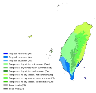 Территория, контролируемая Китайской Республикой, занимает 36 197 км²[14] и включает в себя 168 островов, включая Тайвань, архипелаг Пэнху, Цзиньмынь и архипелаг Мацзу, а также ряд более мелких островов: Уцю, Тайпин и Пратас.