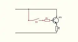 Схема транзисторного ключа по схеме с общим коллектором, включающего и выключающего ток в нагрузку R2. На рисунке в качестве управления ключом показан механический ключ S1, но обычно сигнал управления на такой ключ подаётся от логических элементов или логических выходов микроконтроллера.