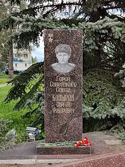 Мемориальная доска героя советского союза Козырева Сергея Федоровича на школе №3 в городе Выкса - Памятник на Аллее Славы у вечного огня в городе Выкса