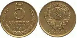 | 5 kop | 25 | 5 | 1,5 | Латунь (сплав ЛМц58-2) | 1961-1962 1965—1991 | |