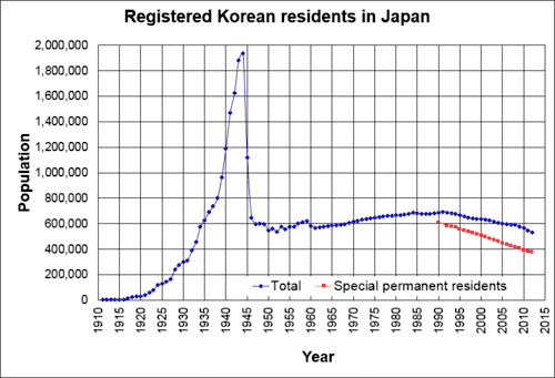 Сразу после окончания Второй мировой войны в Японии проживало примерно 2,4 миллиона корейцев; большинство репатриировалось в свои родовые дома в южной части Корейского полуострова, оставив в Японии только 190 000 к 1946 году[24].