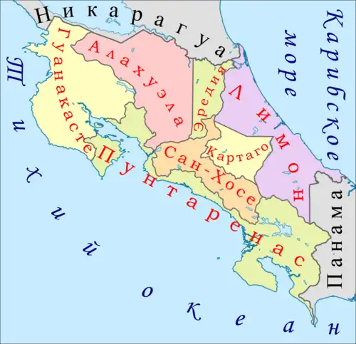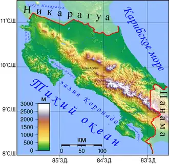 Ко́ста-Ри́ка (исп. Costa Rica — «богатый берег»[5]), официальное название — Респу́блика Ко́ста-Ри́ка (исп. República de Costa Rica) — государство в Центральной Америке. Граничит с двумя странами: Никарагуа на севере и Панамой на юго-востоке. Тихий океан омывает берега с юга и запада, Карибское море — с востока.