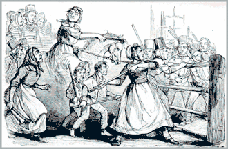 Валлийские рабочие, переодетые женщинами, в ходе бунтов Ребекки. Illustrated London News, 1843