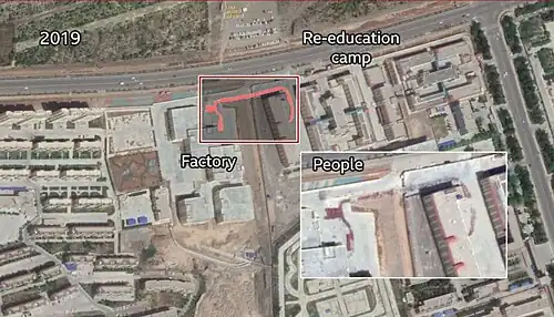 Вид из космоса на лагерь перевоспитания в уезде Куча с прилежащей фабрикой. Май 2019 года. На снимке видна большая группа людей, переходящая с территории лагеря на фабрику