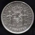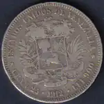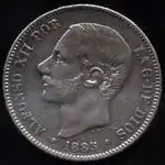 | Альфонс XII 5 испанских песет 1885 | Симон Боливар 5 венесуэльских боливаров 1912 | ||