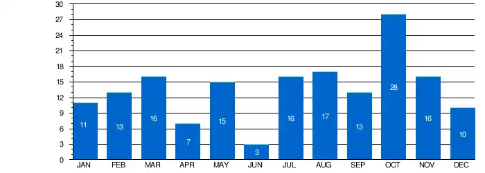 На приведённой ниже диаграмме синие полоски показывают среднее количество дождливых дней в месяц. День считается дождливым, если выпало более 1 мм осадков. Среднее берётся по метеорологическим наблюдениям за последние 10 лет[25].
