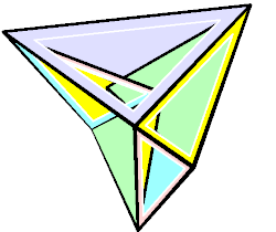 - Выполняя последующие действия следует придавать поверхности такую форму, чтобы сплошные отрезки были «горными хребтами» (то есть выступали из многогранника наружу), а пунктирные отрезки были «долинами» (то есть вдавались бы внутрь многогранника). Изогните поверхность в пространстве и склейте между собой каждые два чёрных отрезка, соединённых на развёртке зелёной дугой окружности, а затем склейте два синих и красных отрезка.