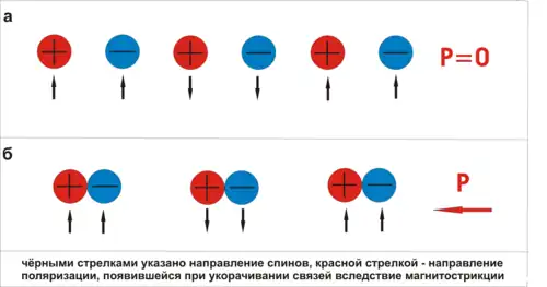 Для появления сегнетоэлектрического порядка в коллинеарных магнетиках требуется присутствие неэквивалентных магнитных ионов с разными зарядами. Это могут быть ионы разных переходных металлов или ионы одного элемента, но разной валентности. Магнитная структура инверсно-симметрична и зарядовая тоже, но их центры симметрии различны. Таким образом, система в целом теряет элемент симметрии и может стать сегнетоэлектрической.