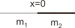 Потенциальная энергия, как функция координаты неизменна, но масса для частицы слева и справа от нуля различна