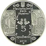 На аверсе: малый государственный герб Украины, в центре — стилизованное изображение двух птиц, слева и справа — традиционная украинская одежда — кожухи, шапки, кептари. Надписи «НАЦІОНАЛЬНИЙ БАНК УКРАЇНИ 5 ГРИВЕНЬ 2012», логотип Монетного двора НБУ.
