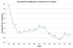 Суммарный коэффициент рождаемости имеет значительные региональные отличия. Например, на западе Мраморноморского региона он составляет 1,55 (близок к соседним Болгарии и Греции), а в Турецком Курдистане, населённой преимущественно курдами, он равен 3,42 (близок к Сирии).[20]