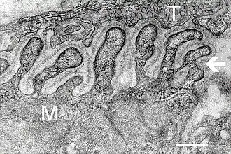 В нервно-мышечной системе нервы центральной нервной системы и периферической нервной системы связаны и работают вместе с мышцами[1]. Нервный отросток подходя к сарколемме мышечного волокна утрачивает миелиновую оболочку и образует сложный аппарат с плазматической мембраной мышечного волокна, образующийся из выпячиваний аксона и цитолеммы мышечного волокна, создавая глубокие «карманы». Синаптическая мембрана аксона и постсинаптическая мембрана мышечного волокна разделены синаптической щелью. В этой области мышечное волокно не имеет поперечной исчерченности, характерно скопление митохондрий и ядер. Терминали аксонов содержат большое количество митохондрий и синаптических пузырьков с медиатором ацетилхолином.