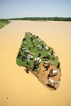 Большая часть территории Нигера относится к аридной и семиаридной зонам. Потенциальное испарение достигает 2000-3000 мм в год, в несколько раз превышая количество осадков. Периодически страна сталкивается с длительными засухами. Они наблюдались в 1910—1915 гг., 1940—1944, 1968—1974, 1984—1985 гг. Повсюду понижается уровень грунтовых вод, пересыхают колодцы, страдает земледелие и скотоводство[22].