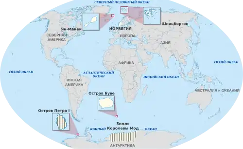 Заморской территорией Норвегии является остров Буве в южной части Атлантического океана. Страна также претендует на территории в Антарктике, подпадающие под действие конвенции 1961 года, — остров Петра I и Землю Королевы Мод.