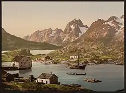 Ближе к берегу лежит большой ледник Свартисен (Svartisen, 65 км длины, площадью более 1000 км², 1097 м высоты). Только западный склон горы принадлежит Норвегии, остальная же часть, по ту сторону высочайшего горного хребта, шведская. От внутренних углов морских заливов граница королевства проходит местами всего в 20—30 км, а в одном месте — даже в 15 км. Важнейшими фьордами на этом берегу являются Бальс (ниже Лингена), Маланген, Офотен, Сальтен, Рана и Вефсен. Перед материком расположены многочисленные и в основном крупные гористые острова; севернее других лежит большая группа островов Вестеролен, из которых группа островов Лофотен далеко выходит в море.