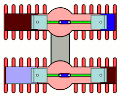 H-образный двигатель можно рассматривать как два оппозитных двигателя, расположенных один сверху другого или один рядом с другим, у каждого из которых есть свои собственные коленчатые валы, которые затем соединяются с одного конца. H-образная конфигурация позволяет создать многоцилиндровые двигатели, которые короче, чем другие варианты, что предоставляет преимущества на воздушных судах. Для гоночных автомобилей данная схема представляет собой недостаток не только из-за высокого центра тяжести из-за расположения одного коленчатого вала над другими, но также и потому, что двигатель сам должен располагаться достаточно высоко от земли, чтобы обеспечить просвет под выхлопные трубы. В плане отношения мощности к весу данная схема также хуже, чем двигатель простой конфигурации, использующий один коленчатый вал.
