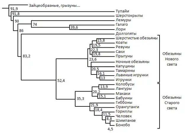 Филогенетическое дерево приматов (хронограмма). Цифры показывают ориентировочное время расхождения филогенетических групп (млн лет) по данным молекулярной филогенетики (http://www.onezoom.org/ Архивная копия от 2 сентября 2011 на Wayback Machine). Показаны также родственные приматам тупайи и шерстокрылы.