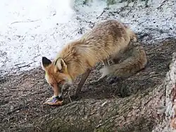 Птицы (преимущественно водоплавающие и куриные[26]) не настолько важны в рационе, как грызуны, хотя лисица никогда не упустит случая поймать птицу, оказавшуюся на земле (от мелких до крупных, вплоть до гусей и глухарей), а также уничтожить кладку яиц или нелетающих птенцов. Похищает и домашних птиц, но, по наблюдениям зоологов, делает это намного реже, чем принято считать[27].
