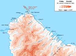 76. Frank, 1990, pp. 589—590, Jersey, 2008, pp. 378—380, 383, 400—401, Miller, 1995, pp. 342—343, 346. Японцы знали о приблизительной численности сил Джорджа от двух захваченных в плен американских солдат в бою возле Тити на южном берегу. После допроса оба американских пленных были убиты. В помощь батальону Яно, который насчитывал к этому времени около 350 человек, были переданы 60 солдат из 124-го и 28-го пехотных полков. 3 февраля японцы потеряли пять бомбардировщиков G4M fво время атаки на флот Хэлси, среди погибших был подполковник Гэнъити Михара, командир 705-й авиагруппы. Американский 161-м полком в это время командовал полковник Джеймс Дальтон II (Miller, 1995, p. 346).