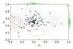Байесовская оптимизация — это метод глобальной оптимизации для неизвестной функции (чёрного ящика) с шумом. Применённая к гиперпараметрической оптимизации байесовская оптимизация строит стохастическую модель функции отображения из значений гиперпараметра в целевую функцию, применённую на множестве проверки. Путём итеративного применения перспективной конфигурации гиперпараметров, основанной на текущей модели, а затем её обновления, байесовская оптимизация стремится собрать как можно больше информации об этой функции и, в частности, место оптимума. Метод пытается сбалансировать зондирование (гиперпараметры, для которых изменение наименее достоверно известно) и использование (гиперпараметры, которые, как ожидается, наиболее близки к оптимуму). На практике байесовская оптимизация показала[6][7][8][9] лучшие результаты с меньшими вычислениями по сравнению с поиском по решётке и случайным поиском ввиду возможности суждения о качестве экспериментов ещё до их выполнения.