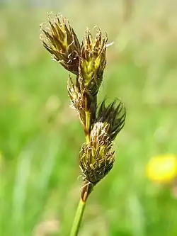 Соцветие 2—4 см длиной, колосовидное, продолговатое, скученное, густое, из 4—8(10[1]) колосков. Колоски гинекандрические, продолговато-яйцевидные или обратнояйцевидные, 0,7—1 см длиной, многоцветковые, серебристо-зелёные. Кроющие чешуи продолговато-яйцевидные, от бурых и красновато-бурых до светло-бурых и бледно-зелёных, а также серебристых, по килю зелёные, с белоперепончатыми краями, равные мешочкам или едва короче их. Мешочки вогнуто-выпуклые, яйцевидные или продолговато-яйцевидные, 4—5 мм длиной, слегка отклонённые, в зрелом состоянии светло-бурые (включая носик) или бледно-соломенные, с обеих сторон с 8—10 жилками[1], по краям с довольно широким (до 0,3 мм) светлым крылом, в основании округлые, с удлинённым коротко-двузубчатым носиком, спереди глубоко расщеплённым. Кроющие листья чешуевидные, самые нижние иногда узколинейные.