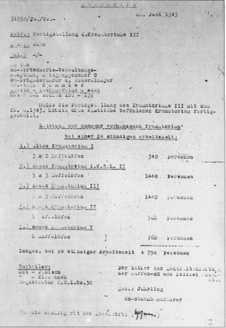 В записке, посланной 28 июня 1943 года в Берлин генералу СС Каммлеру, указывается число тел, от которых можно было избавляться за один день в Освенциме, — 4756[47]. Фирма «Топф и сыновья», производившая печи для крематориев, получила в 1951 году патент, в котором говорится, что один муфель может кремировать один труп за полчаса[48]. 14 июля 1941 года Топф писал Гиммлеру[49]: