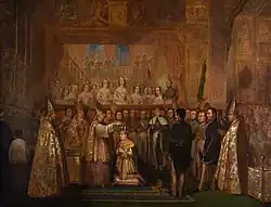 Свадьба Педру I и Амелии Лейхтенбергской. Рядом с ним его дети от Марии в порядке старшинства: Педру, Жануария, Паула и Франсишку, отсутствуют Мигел, Жуан и Мария. Картина Жан-Батиста Дебре