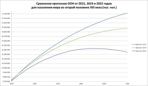 Демографы предполагают, что высокие темпы роста населения мира сохранятся до 2025 г., затем темпы роста резко снизятся, и по достижении численности населения 12—14 млрд, ориентировочно к 2100—2135 г.г., наступит стабилизация[3]. Однако, по некоторым прогнозам, даже при стабилизации численности населения на уровне 9 млрд человек, при условии сохранения масштабов производственной деятельности, в результате изменения климата планеты может произойти необратимая деградация природных систем жизнеобеспечения, что может поставить человечество на грань выживания[25].