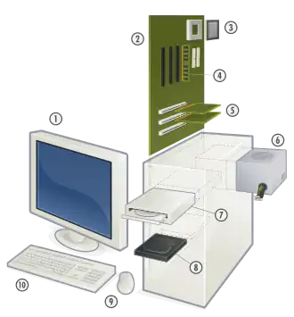 Основные составные части типичного персонального компьютера: 1 — монитор, 2 — материнская плата, 3 — центральный процессор, 4 — оперативная память, 5 — карты расширений, 6 — блок питания, 7 — оптический привод, 8 — жёсткий диск, 9 — компьютерная мышь, 10 — клавиатура