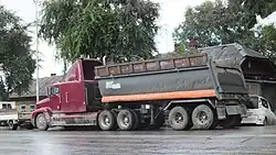 - Полуприцепы европейского типа, как правило, имеют три моста с односкатной ошиновкой и дисковыми (для стран с хорошим покрытием дорог и относительно теплыми зимами) или барабанными (в Скандинавии — несмотря на хорошую дорожную инфраструктуру, из-за обилия снега зимой, слякоти днем и морозов ночью; в ряде стран СНГ и в России — по той же причине и в виду плохого состояния дорожной сети за пределами крупных населенных пунктов, большого количества дорог без асфальтового покрытия на периферии) тормозами.[5] Иногда один-два моста могут подниматься от земли автоматикой при движении без груза.