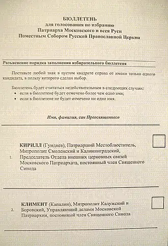 Бюллетень для голосования по избранию Патриарха Московского и всея Руси Поместным Собором Русской Православной Церкви