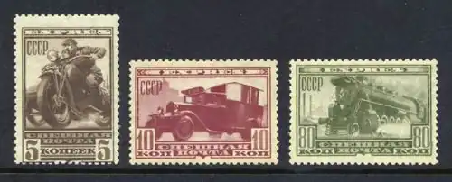 В апреле 1932 года были выпущены три марки спешной почты с изображением транспортных средств для оплаты экспрессных почтовых отправлений. На миниатюрах надпись «Спешная почта. Express»[2][19].