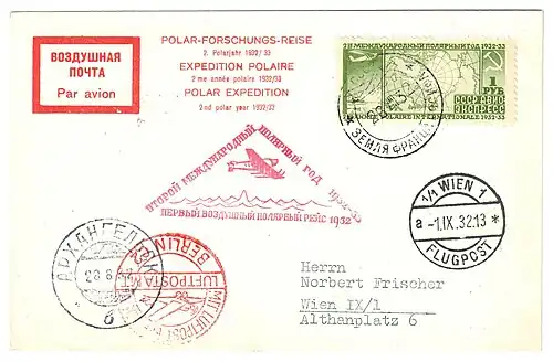 Конверт, франкированный авиапочтовой экспрессной маркой СССР в честь 2-го Международного полярного года, который был отправлен 26 августа 1932 года с Земли Франца Иосифа в Архангельск, а затем в Берлин и Вену и имеет оттиск треугольного штампа «Второй международный полярный год 1932—33. Первый воздушный полярный рейс 1932»