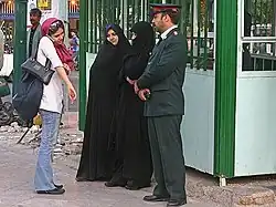 В Иране женщины обязаны покрывать голову, если рядом находятся чужие мужчины, в том числе и на улице; покрывать тело до кистей рук и ноги по щиколотку. На практике многие девушки молодого поколения соблюдают данное правило лишь формально, нося обтягивающую одежду и пуская из-под платка волосы, зачастую превращая его в элемент украшения, однако они рискуют нарваться на так называемый назидательный патруль, который может провести с девушкой «воспитательную беседу»[37].