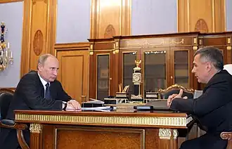 Президент Татарстана Р. Н. Минниханов с премьер-министром России В. В. Путиным в его служебном кабинете, 2011 год