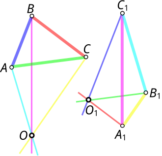 1. Рассмотрим геометрию двумерного пространства, в которой пары векторов «равны», только если они переводятся одна в другую движением плоскости, а не трёхмерного пространства. В такой геометрии пары единичных взаимно перпендикулярных векторов , и , не «равны» между собой, поскольку среди движений плоскости нет зеркальной симметрии. Равными единичных перпендикулярных парами векторов будут , и , , которые совпадают при повороте на вокруг точки — общего начала векторов (см. рисунок справа)[23].