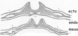 Известно, что к концу третьей недели развития зародыш человека имеет вид трёхслойной пластинки, или трёхслойного щитка. В области наружного зародышевого листка видна нервная трубка, а глубже — спинная струна, то есть появляются осевые органы зародыша человека. Тело зародыша из плоского щитка превращается в объёмный, эктодерма покрывает тело зародыша со всех сторон.