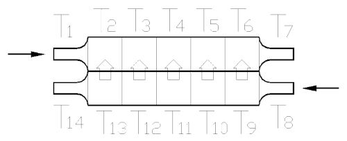 Схема, поясняющая работу противоточного теплообменника. Холодное тело подаётся слева при температуре Т1. Горячее — справа при температуре Т8. Температуры Т2…Т6 везде попарно меньше температур Т13…Т9, т.е. Т2 < Т133 < Т12 и т.п.