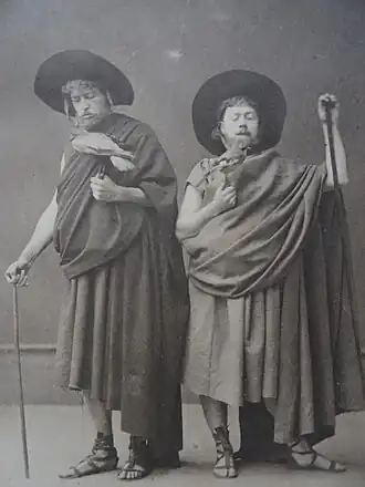 Частью костюма в пьесах Аристофана является фаллос, который изготавливался из кожи, окрашивался в красный цвет и пришивался к элементам одежды. Его гротескный размер позволял разглядеть сценическую деталь со всех мест театра. Зачастую он выступал из-под театральной туники, по длине не достигавшей коленей[36]. Связанные с ним сцены могли быть свидетельством успешности или неудачливости того или иного персонажа. Так, в комедии «Осы» Филоклеон обращается к флейтистке, от которой так и не получает ожидаемого удовольствия, со словами: «Влезай сюда за мной, мой золотой жучок! / Своею ручкою держись за этот жгут, / Но осторожнее: непрочен, стар он стал… / Однако трение не тягостно ему». Герой «Птиц» Писфетер, напротив, предлагает своей невесте Басилее на пути к брачной постели коснуться его «широких крыл» — по мнению Гвендолин Комптон-Энгл, в этой сцене наблюдается перенос функции фаллоса на крылья, а сама женщина является символом награды, которую обретает победитель[37]. По словам философа Сергея Гарина, «для античного грека классических Афин в фаллической символизации не было ничего непристойного, „срамного“, греховного»[38].