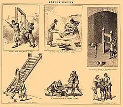 1. Дыба и кнут (Россия, XVII в.; по Корбу). 2. Пытка огнем (Россия, XVII в.; по Корбу). 3. Дыба в Западной Европе (по уголовному уложению Марии-Терезии, XVIII в.). 4. Тиски для ног (по «Терезиане», XVIII в.). 5. Тиски для пальцев (по «Терезиане», XVIII в.). 6. Вытягивание на лестнице (по «Терезиане», XVIII в.).